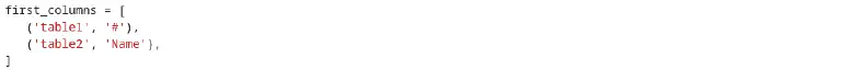 # Use the format ('table_name', 'column_name'), i.e. ('table 1', 'column A')
