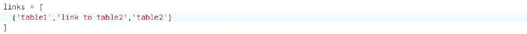 # Use the format ('table_name', 'column_name', 'other_table_name'), i.e., ('table 1', 'link to table 2', 'table 2')