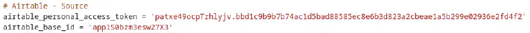 Utilisez les liens de documentation Airtable dans le script pour savoir où obtenir le PAT et l’ID de base.
