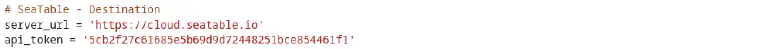 Sous le commentaire SeaTable – Destination , collez l’URL du serveur SeaTable et fournissez le jeton API . Le jeton API doit accorder des autorisations de lecture et d’écriture. Si vous utilisez SeaTable Cloud, alors l’URL pré-remplie « https://cloud.seatable.io » est correcte. Si vous utilisez un autre serveur SeaTable, saisissez son URL. (L’URL doit toujours être saisie avec https:// ou http://.) L’URL et le jeton doivent être placés entre guillemets simples.