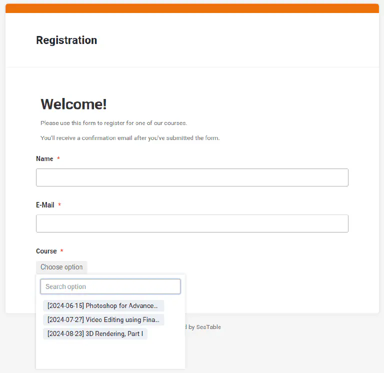 SeaTable takes this restriction into account and ensures that only courses that are not yet fully booked are offered in the web form.