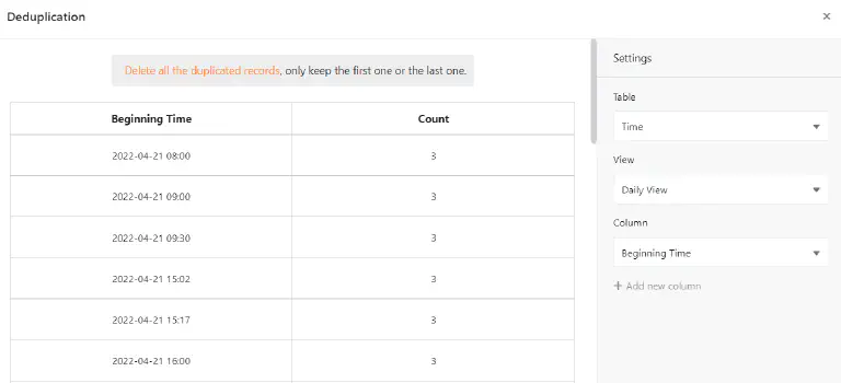 O plugin de desduplicação de dados descobre entradas duplicadas numa tabela. Isto é especialmente útil com grandes quantidades de dados para detectar duplicados e removê-los. Pode eliminar todas as entradas duplicadas com apenas um clique.