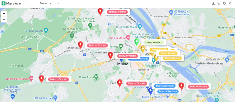 As localizações podem ser apresentadas num mapa com o plug-in de mapa. Pode visualizar as informações geográficas introduzidas com marcadores de posição ou imagens. O plug-in de mapas pode tratar coordenadas GPS e endereços. No entanto, os endereços têm de ser únicos para poderem ser apresentados.