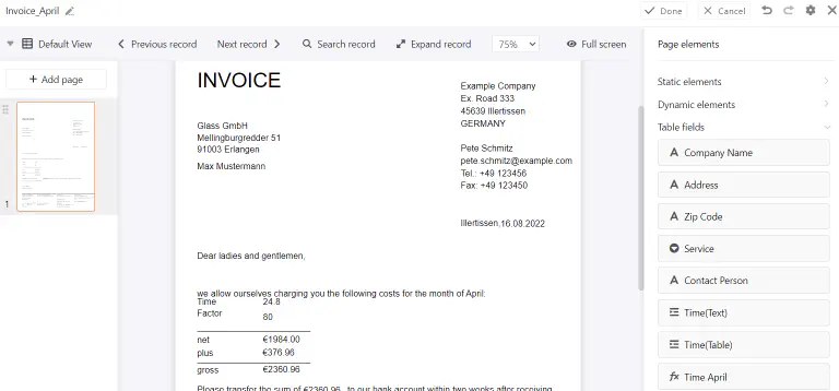 Com a ajuda do plug-in de design de páginas, pode criar o layout de documentos como cartas de formulário, cartões de visita e certificados e preenchê-los com os dados da sua tabela. Mais precisamente, pode criar layouts com elementos estáticos que são complementados e individualizados por elementos dinâmicos e campos de tabela. Estes oferecem-lhe a grande vantagem de, dependendo do registo de dados, inserirem todas as informações relacionadas (por exemplo, o nome de uma pessoa, a morada e o cargo) em modelos normalizados, sem que tenha de copiar manualmente os dados para os documentos. Desta forma, pode criar facturas prontas a imprimir, certificados ou outros documentos importantes a partir dos dados armazenados com apenas alguns cliques.