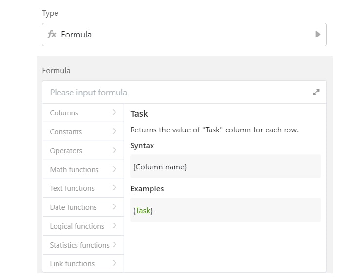 Помимо перечисленных функций, в редакторе формул имеется один или несколько списков столбцов. Это столбцы текущей таблицы и связанные с ней столбцы другой таблицы в базе. Если щелкнуть на значке “+” рядом с ним, то имя столбца добавляется в качестве элемента в поле ввода в формате {ColumnName} или {LinkedTable.ColumnName}. Вы можете использовать этот элемент непосредственно в своей формуле. В качестве альтернативы можно, конечно, ввести имя столбца в виде {ColumnName} вручную.